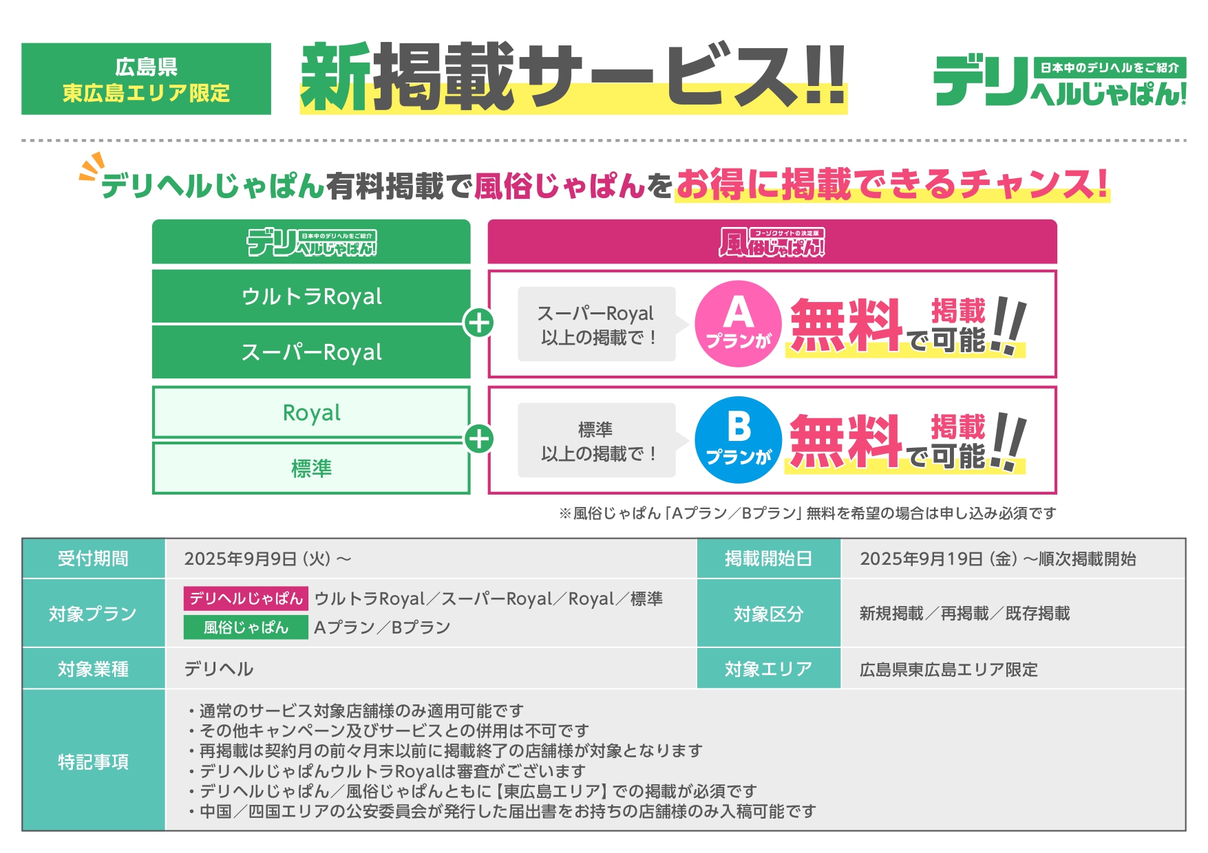 ・デリヘルじゃぱん/風俗じゃぱんともに【東広島エリア】での掲載が必須です。